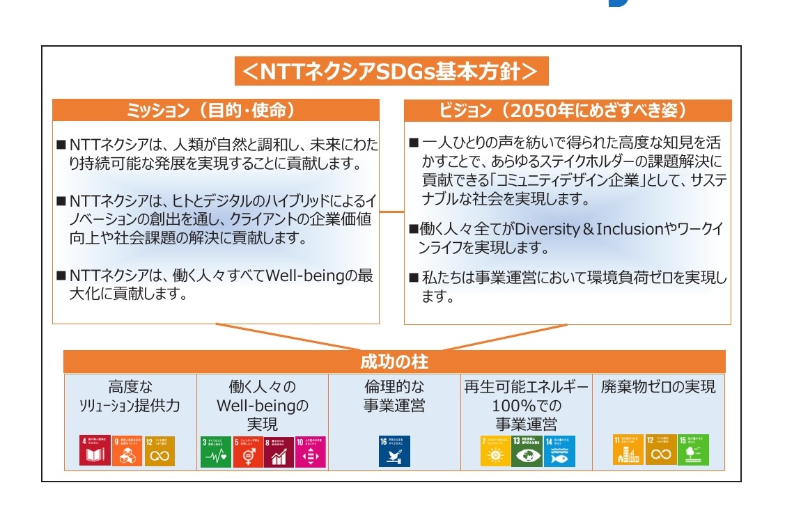 株式会社NTTネクシアのSDGsへの取り組みについて、SDGs推進の主管であるシェアードサービス部門サステナビリティ推進担当課長の有馬哲朗さんにお話を伺いました。「当社では、『お客様と、ともに未来を描き、ともに成長するパートナーであり続ける』という企業理念を掲げています。この実現のためには、利用者の満足度向上と企業・地域社会の課題解決に貢献する『コミュニティデザイン企業』として社会から信頼され価値を認められる存在でなければならないと考えています。『コミュニティデザイン企業』に向けては、事業活動の持続的成長だけでなく、あらゆるステークホルダーの持続的成長への貢献や地方創生への貢献も必要不可欠な活動であると考えています。この考え方は、2015年に国連で採択された『すべての企業は自社の事業活動を通じてSDGsの実現に貢献する』という考え方とも合致するものであると捉えており、事業戦略にSDGsの考えを取り入れています。そして、SDGs達成に向けた取り組みにあたり、全員が共通認識のもと行動することを目指し『NTTネクシアSDGs基本方針』を策定しました」と説明します。