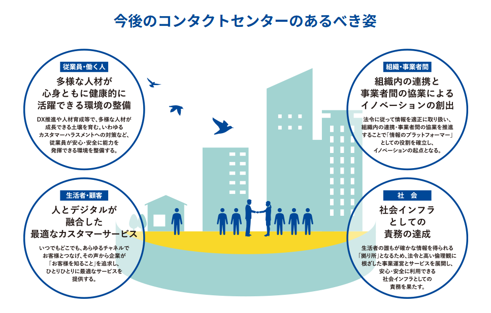 そうです。4つの視点からなる次の世代のコンタクトセンター像を明確化しました。具体的には、生活者・顧客、従業員・働く人、組織・事業者間、社会の各項目について定義しています。この指針を示すとともに、その実現に向けた支援を通じて、職業・職場としての魅力を高め、業界の健全な発展に尽力していくことが協会の役割だと考えています。