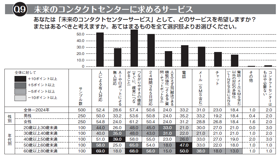 年代別でみると、年代が高くなるほど「人による有人対応」「電話」が高くなる傾向が明らかであり、高年代層はコンタクトセンターに大きな変化を求めていないことがうかがわれる。