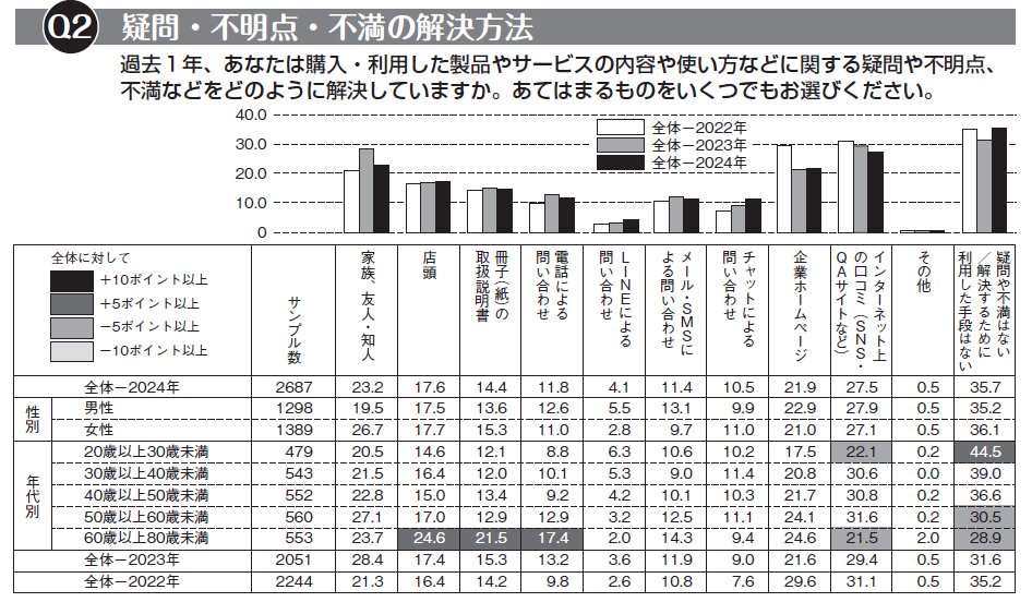 年代別でみると、60代以上では「店頭」「冊子の取扱説明書」「電話による問い合わせ」が高く、従来からの手段を継続して利用していることがうかがわれる。 2023年との比較では、「家族、友人・知人」がやや低下している程度で、大きな変化はなかった。