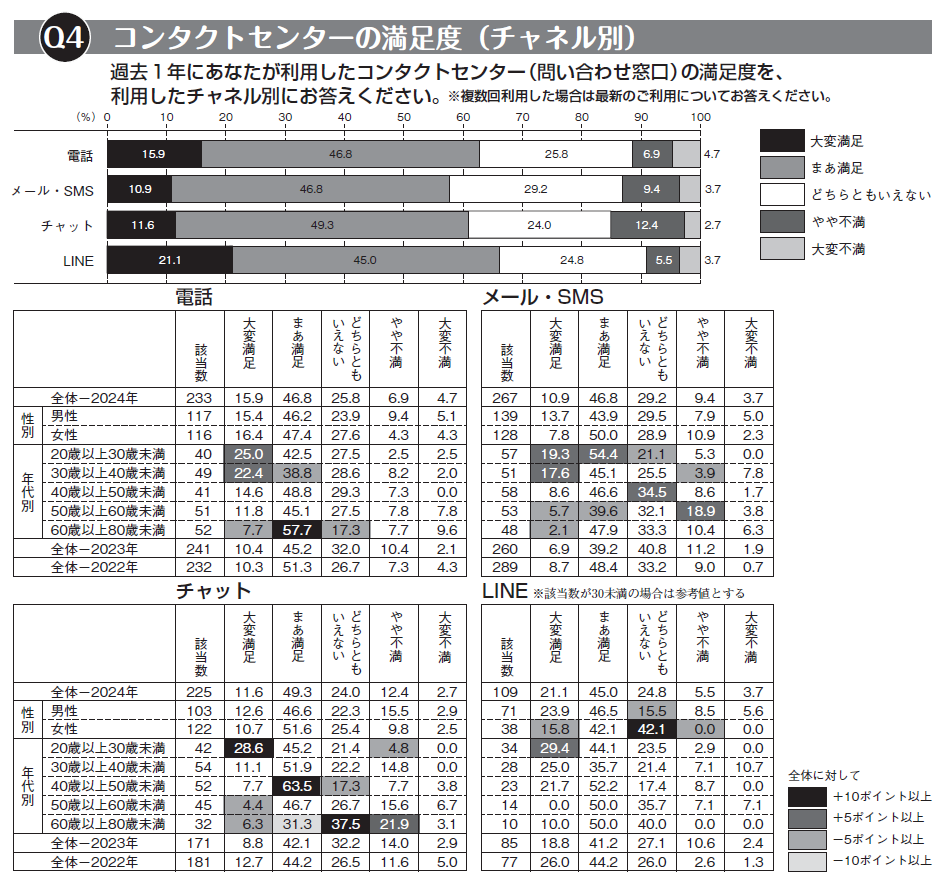 『電話』(62.7%)、『チャット』(60.9%)も6割超が「満足」を示したが、『チャット』では「不満」(「やや不満」+「大変不満」)が15.1%で、他チャネルよりやや高い。『メール・SMS』に「満足」を示した人は57.7%にとどまった。