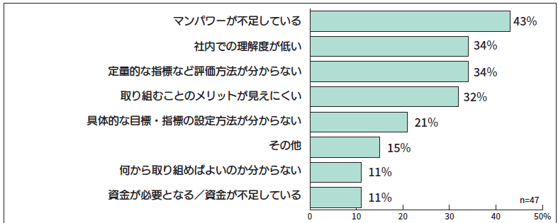 課題として、「マンパワーが不足している」が43%で最も多く、続いて「社内での理解度が低い」と「定量的な指標など評価方法が分からない」が34%で並びました。上位3つをはじめ挙げられた課題に関しては、現在の事業活動や日常業務とSDGsを関連付けたり、一体化させたりすることの難しさを表していると感じました。