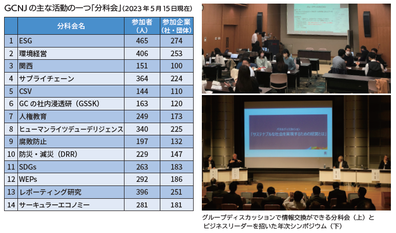 GCNJの活動の中心である分科会は、会員同士で苦慮しているところや取り組み事例などを共有することで、アドバイスや新しい情報を得られる場となっています。現在、SDGs・ESG・サプライチェーン・環境経営・サーキュラーエコノミー・ヒューマンライツデューデリジェンス・WEPsなどの全14テーマについて、参加メンバーが学び、様々な知識・経験を共有する機会となっており、約4000名の登録があります。