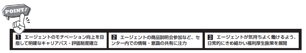 ちなみに同社コンタクトセンターでスーパーバイザー(SV)としての役割を担うリーダーは主に正社員で、東京・大阪の2拠点合計で70名ほど存在するが、その約半数はパートタイム社員のエージェントとして採用されたスタッフからキャリアパス制度によって登用されたものである。このように、身近に数多くの“成功例”が存在することで、やる気のあるエージェントのモチベーションをさらに喚起する状況が実現されている。