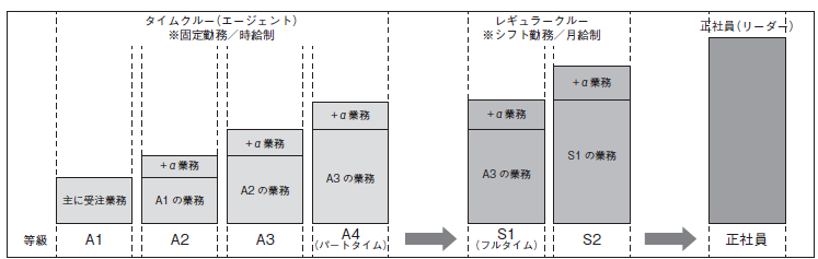 同社コンタクトセンターにおいてエージェントのエンゲージメント向上のために行っている施策の中でまず注目されるのは、明確なキャリアパス・評価制度の確立だ。 同社の目指すところであるお客様へ「心おどる、瞬間を。」提供していくためには、エージェントの心も常にポジティブな状態にあることが理想であるが、業務を“やらされている”という意識では、このような状態を実現することは難しい。そこで同社では、パートタイム社員であるエージェントの等級をA1 ~ A4に階層化して、各エージェントが担う業務内容・レベルによって階層を上げていける仕組みを提示するとともに、高い階層になるほど上昇する時給も公開。さらに最上位のA4階層に要求される業務を担当する人の中で希望する人は、月給制の契約社員となることができ、最終的には正社員に登用するルートも提示し、エージェントが主体的・能動的に業務に取り組むことができる環境を提供している。