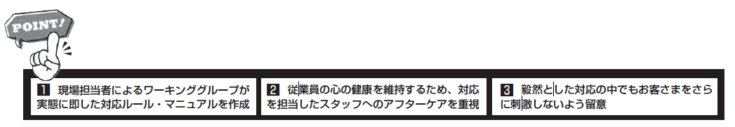 なお、ステップ④の制止・警告においては、例えば「 長時間の拘束行為」に対しては、「恐れいりますが、既に30分以上のお話しをさせていただいており…」といった表現をするなど、直接的に「カスハラ」という単語を持ち出すことで、お客さまをさらに刺激しないよう留意している。