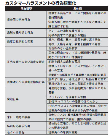 WGの検討によって、同社にとってカスハラは「①過剰な要求、②不当な言いがかり、③過度な大声や暴言を繰り返し執拗に行う行為のことで、企業としての対応の枠を超え、申し出自体が迷惑行為となっていること」と定義された。そしてこの定義に基づいて、「長時間の拘束行為」「過剰な繰り返し行為」など9つの行為類型を抽出し、それぞれについて具体的な行為例を明示することで、社内のカスハラに対する認識の統一化を図った。